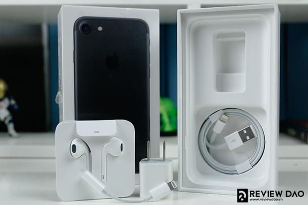 iPhone 7 được đóng trong 1 chiếc hộp giấy đã rất quen với chúng ta, có điều Apple quyết định in mặt sau chiếc iPhone lên nắp hộp tùy thuộc vào phiên bản màu sẽ có những hình ảnh khác nhau, cá nhân mình không thích cách làm hộp này của Apple vì nó đã không còn đẹp và hiện đại như trước. Phụ kiện đi kèm sẽ có củ sạc, cáp Lightning, và một chiếc tai nghe sử dụng cổng Lightning.