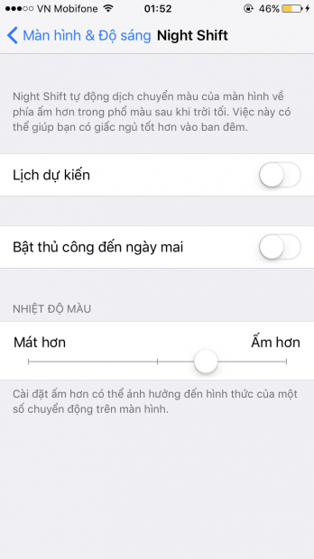 Apple cung cấp cho người dùng chế độ Night Shift có thể điều chỉnh màu sắc trong màn hình thiết bị để đảm bảo mắt bạn không tiếp xúc trực tiếp với ánh sáng gam màu lạnh vào ban đêm. Bạn có thể cài đặt thời gian bắt đầu và kết thúc của chế độ này.