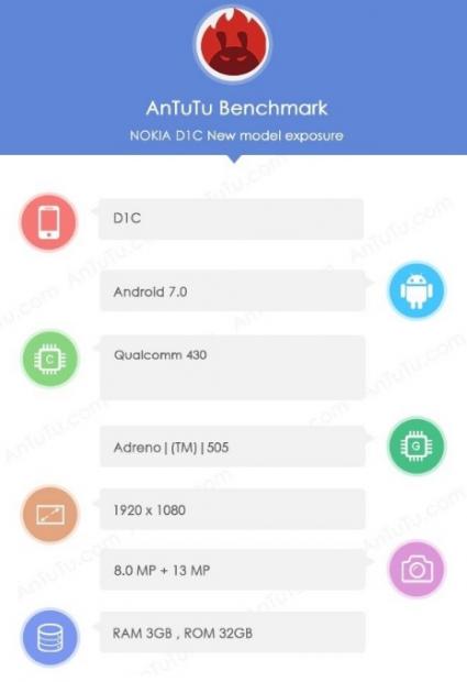 Cụ thể, AnTuTu xác nhận rằng Nokia D1C sẽ chạy chip xử lý Snapdragon 430 và con chip này sẽ là một con chip 8 nhân, bên cạnh đó sẽ là đồ họa GPU Adreno 505. Đến nay vẫn chưa rõ màn hình của máy nhưng nó sẽ có độ phân giải Full HD 1920 x 1080 pixel, bộ nhớ RAM vẫn là 3GB và bộ nhớ trong sẽ là 32GB. Ngoài ra, máy cũng sẽ được trang bị camera sau 13MP, camera trước 8MP để phục vụ cho nhu cầu selfie và chat video của người dùng. Nokia D1C sẽ chạy hệ điều hành Android 7.0 khi xuất xưởng.