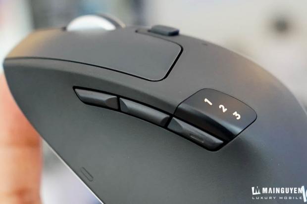 Lệch qua bên trái một chút sẽ là nơi Logitech bố trí 2 nút chức năng là Back và Forward đặt để lật trang khi duyệt web trong khi nút cuối cùng có chức năng chuyển đổi kết nối sử dụng giữa 3 thiết bị khác nhau. Đèn nền của 3 con số này có độ sáng khá thấp, khiến việc chuyển đổi sử dụng của mình gặp chút khó khăn khi phải đưa vào gần tầm 20cm thì mới dễ dàng nhìn thấy.