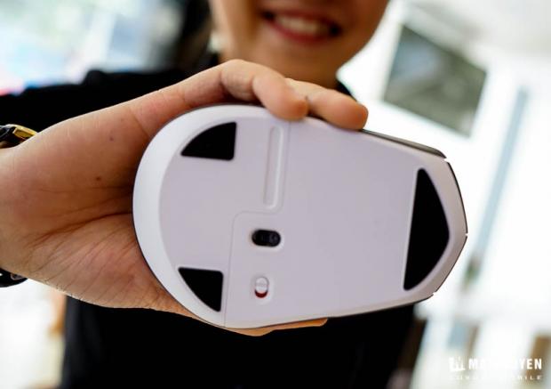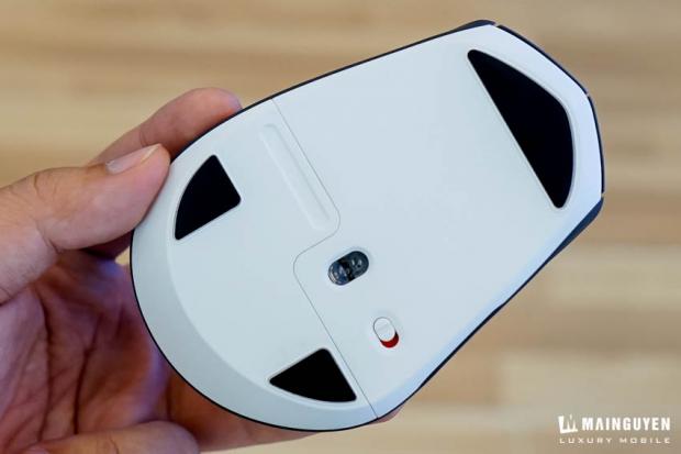 Lật phía mặt đáy lên, mình khá bất ngờ khi Logitech lại phối màu trắng ở phía dưới cho nó vì đơn giản là đây là một lớp nhựa khá bám và nếu xài lâu thì ắt hẳn M720 sẽ dễ bị bán bẩm. Bạn sẽ yên tâm phần nào vì ta sẽ có 3 lớp đệm màu đen được làm nhẵn đi giúp cảm giác lượt chuột êm hơn, đồng thời chúng nhô lên cũng kha khá nên lớp nhựa trắng sẽ khó tiếp xúc với vết bẩn hơn, nhưng hãy chắc chắn rằng, bạn sẽ có miếng lót chuột hoặc mặt bàn của bạn phải luôn sạch sẽ.