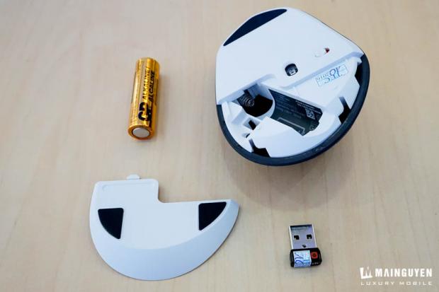 Gạt phần khấc ở phía dưới cùng ra, nhưng gì bạn có là 1 USB Dongle, một viên pin AA mà theo Logitech, M720 sẽ sử dụng được lên tới 2 năm. Đây cũng là một điểm mà mình rất thích ở các sản phẩm dòng M số của Logitech thay vì như MX Anywhere 2, USB Dongle của bạn sẽ phải luôn ghim ở máy tính hoặc cất một cách kĩ lưỡng vì không có nơi chứa bên trong.