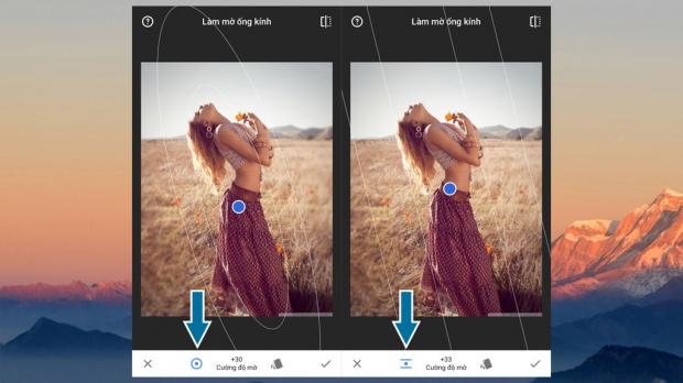 Bước 2: Chọn công cụ “Blur” > sẽ có hai vòng tròn xuất hiện, bạn sử dụng hai ngón tay để thay đổi kích thước và khu vực xóa phông trên bức ảnh.