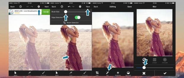 Bước 1: Đầu tiên, bạn mở ứng dụng chọn ảnh nhấn vào công cụ “Blur” và xóa vùng mà bạn không muốn làm mờ đi > sau đó nhấn “Next” để tiến hành xóa phông.