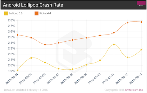 Trong khi đó khảo sát với khoảng 20.000 ứng dụng Android cho thấy, Lollipop 5.0 ổn định hơn phiên bản KitKat 4.4. Tuy nhiên, nền tảng mới nhất của Google chỉ chiếm 1,6% thị phần các bản Android. Ice Cream Sandwich 4.0 và KitKat 4.4 chiếm tới 46% thị phần nhưng lại là phiên bản “tệ nhất” với tỉ lệ ứng dụng tự động bị thoát khoảng 2,5%.