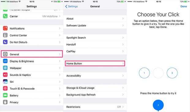 Bạn cũng có thể lựa chọn được mức cường độ của “bộ cảm giác ảo” này bằng cách vào Settings (Cài đặt) > General (Chung) > Home Button (Nút Home).