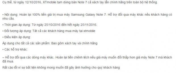 Thông tin đăng tải trên web của XtmobileĐược biết hệ Xtmobile sẽ bắt đầu cho phép trả Galaxy Note 7 từ ngày 25/10 – 25/11/2016. Đối tượng áp dụng là tất cả những máy đã mua tại cửa hàng này kể cả xách tay hay chính hãng.