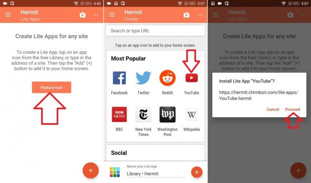 Tiếp đến chọn cho mình một ứng dụng mà bạn muốn tao “lite”. Ở đây mình chọn Youtube, nhấn chọn icon youtube, một hộp thoại hiện lên bạn chọn vào chữ Proceed. Sau vài giây hệ thống sẽ báo hiệu ứng dụng lite đã được tạo thành công. Lúc này, icon của ứng dụng mới sẽ tự động đưa ngoài màn hình chính, bạn đã có thể sử dụng ngay. Rất đơn giản phải không.