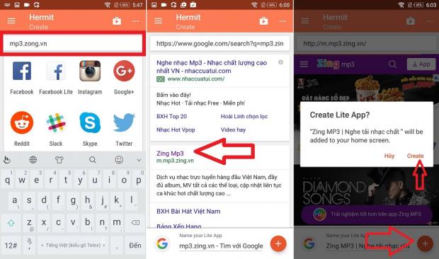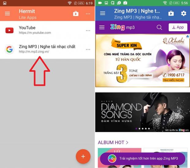 Ngoài ra, Hermit còn hỗ trợ người dùng tạo những ứng dụng dạng nền web (Lite) cho các trang web mà bạn thích. Chỉ việc truy cập vào địa chỉ của một trang web bất kì, trong ví dụ này mình chọn mp3.zing.vn.