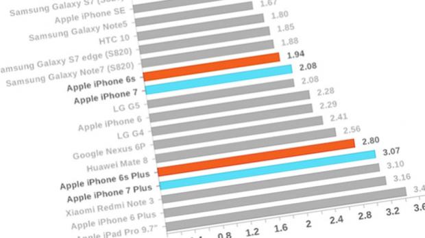 Bảng so sánh tốc độ sạc của iPhone 7 và iPhone 7 Plus so với các smartphone khác