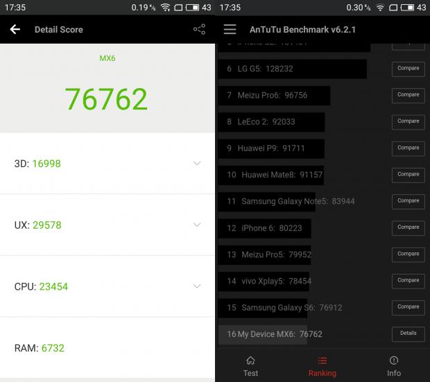 Đầu tiên, với ứng dụng Antutu Benchmark để đo hiệu năng tổng thể, Meizu MX6 đạt được 76762 điểm. Trong đó điểm 3D được 16998 điểm, điểm UX được 29578 điểm, điểm CPU được 23454 điểm và 6732 điểm RAM.