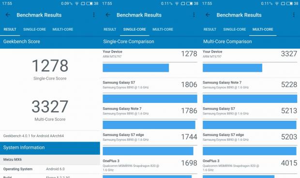 Tiếp theo là ứng dụng Geekbench 3 và Vellamo dùng để đo khả năng xử lý đơn nhân và đa nhân. Với Geekbench 3, Meizu MX6 đạt được điểm số lần lượt là 1278 cho đơn nhân và 3327 cho đa nhân. Còn với Vellamo, thiết bị đạt được 2598 điểm đơn nhân và 3005 điểm đa nhân.