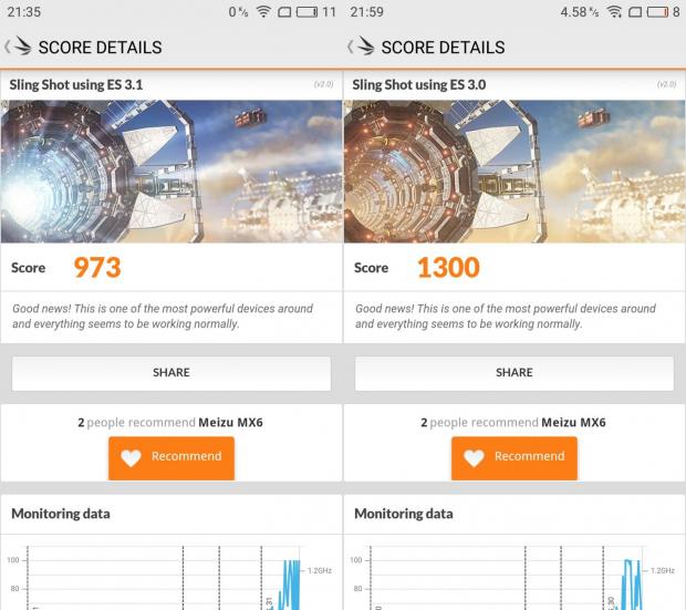 Cuối cùng, với ứng dụng 3DMark dùng để đo khả năng xử lý đồ hoạ. Với phép thử SlingShot 3.1, Meizu MX6 được 973 điểm, còn SlingShot 3.0 là 1300.