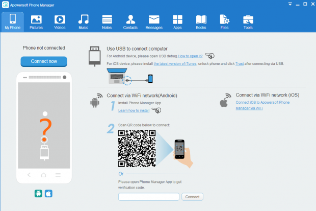 Ở giao diện chính của chương trình bạn sẽ có các tùy chọn như My Phone, Music, Pictures, Apps,… Ngoài ra, bạn cần kết nối thiết bị với máy tính thông qua cable hoặc quét mã qr.