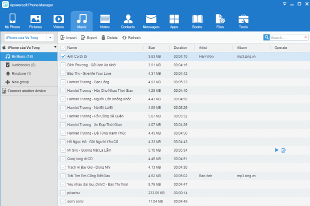 Nếu bạn là người thích nghe những bài hát trên iPhone hay iPad nhưng làm theo kiểu truyền thống qua iTunes thì vô cùng lâu. Bạn nên sử dụng Apowersoft. Công cụ Music trên chương trình cho phép người dùng thêm hay xóa nhanh các bài hát chỉ trong một nốt nhạc.