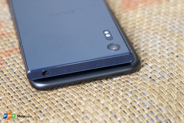Về phía Xperia XZ cạnh trên của máy là nơi đặt micro thu âm và jack cắm tai nghe 3.5mm, cạnh dưới là nơi đặt cổng USB-C, micro đàm thoại. Bền mặt cạnh trên mà dưới được thiết kế phẳng hoàn toàn, vì thế bạn có thể dựng đứng chiếc điện thoại này trên mặt bàn rất dễ dàng.