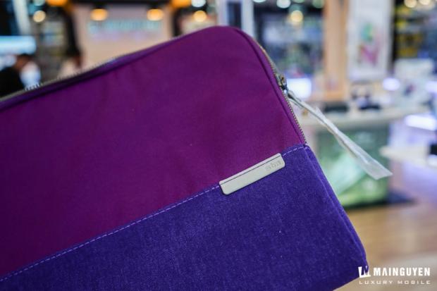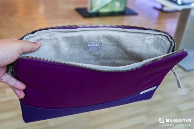 Mình tuy thich những chiếc túi đơn giản gồm 1 màu sắc lạnh, trung tính nhưng STM đã phối màu cho Grace khiến mình cũng không mấy khó chịu khi nhìn vào. Thật sự thì Grace rất nhẹ, có thể nói là một trong những mấu túi chống sốc cho laptop nói chung cũng như Macbook nói riêng nhẹ nhất mà mình đã từng sử dụng qua. Chất liệu cấu thành bên ngoài của Gracelà vài, sờ vào cực kì mịn và mềm, thích tay, hoàn toàn khác biệt so với Skinny Sleevemà mình đã đề cập ở trên. Các móc khóa kéo được STMlàm chăm chút cần thận, to nhưng không hề thô một chút nào, ngược lại cho cảm giác kéo khá êm tay. Ngoài ra, các tay kéo khóa cũng được làm từ da, giúp cho mỗi lần kéo sẽ tạo sự khác biệt vì vốn dĩ tay mình đã quen với các tay khóa làm từ vài hay kim loại. Hơn nữa, Grace cũng là chiếc túi chống sốc có diện tích sử dụng bên trong lớn nhất mà mình giới thiệu trong bài viết này. Nó có thể đựng vừa 2 chiếc Macbook 13 inch dù chỉ đôi chút gương ép. Bạn cũng có thể thấy rõ ở tấm hình bên dưới sau khi mình mở Grace ra, STM đã bọc cho lớp đệm trong cùng một lớp vài mà bạn thường thấy ở các thảm trải cao cấp với các sợi lông dài rất đã.