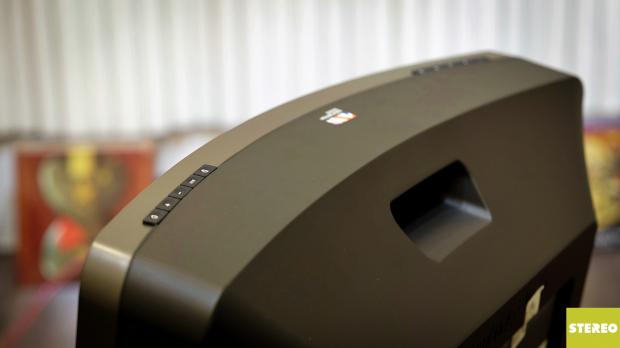Nhìn từ phía sau loa, ta sẽ thấy có một hốc tương đối lớn. Ngoài việc là tay xách để cầm nắm và di chuyển thiết bị thuận tiện hơn, đây cũng đồng thời là bassport của loa, đem lại khả năng cộng hưởng và tái tạo tốt hơn cho phần dải trầm.