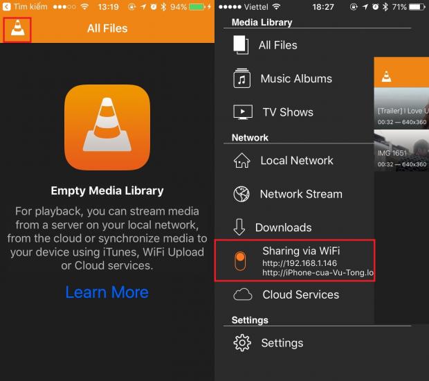 Sau khi tải xong ứng dụng VLC trên thiết bị, hãy mở ứng dụng lên, nhấn vào logo VLC ở góc bên trái màn hình. Sau đó bật tính năng Sharing via WiFi.