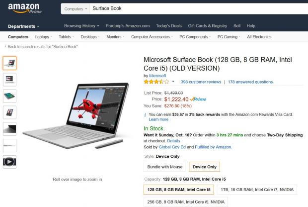 Hiện tại Amazon cũng đã có động thái giảm giá mạnh trên các thiết bị này, cụ thể Surface Pro 4 phiên bản Intel Core i5, RAM 4 GB, ROM 128 GB hiện bán với giá 719 USD (khoảng 16 triệu đồng), trong khi Surface Book với tùy chọn Intel Core i5, RAM 8 GB, ROM 128 GB có giá 1.222 USD (khoảng 27 triệu đồng).
