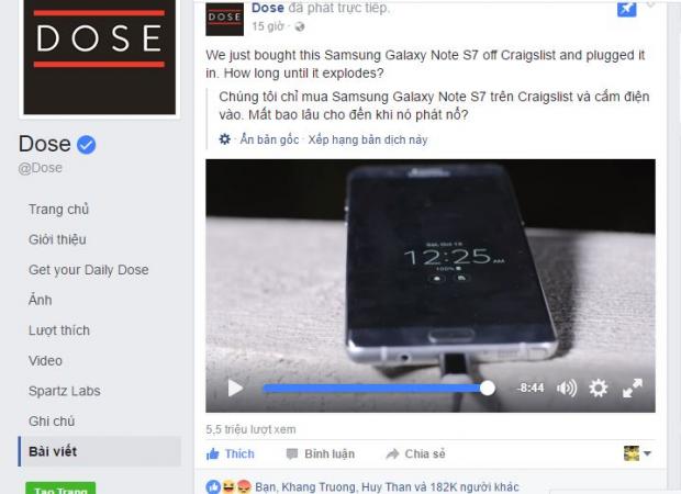 Sau đó, Dose đã cắp sạc Note 7 và quay video livestream đăng lên Facebook để “đợi Note 7 phát nổ”. Mọi thứ có vẻ nhàm chán nhưng không, đã có tới 34 ngàn người xem trực tiếp và sau hơn 4 tiếng đồng hồ sạc điện, Note 7 vẫn nguyên xi, không có chuyện gì xảy ra cả.