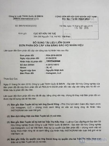 Cáo buộc phản đối thương hiệu Instagram của Facebook tại Việt Nam, được gửi đến Cục Sở hữu trí tuệ. (ảnh VNtinnhanh).Trong khi đó, đến tháng 10 năm 2015, Facebook mới nộp đơn đề nghị cấp giấy chứng nhận thương hiệu Instagram tại Việt Nam. Có nghĩa là Facebook nộp đơn đăng ký khi mà thương hiệu Instagram tại Việt Nam đã được cấp giấy chứng nhận cho cá nhân khác trước đó 4 tháng.