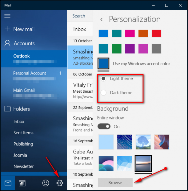 Vào Settings> Personalization ở thanh bên phải. Ở đây, bạn có thể chọn 10 màu sắc khác nhau hoặc sử dụng màu nhấn chung với thiết lập của Windows để tùy chỉnh màu sắc giao diện cho ứng dụng Mail. Bạn có thể chuyển đổi giữa 2 chế độ đọc: Light theme và Dark theme. Để thêm hình nền của riêng bạn, bấm vào nút 'Browse' và chọn bất kỳ hình ảnh nào bạn muốn từ máy tính của bạn.