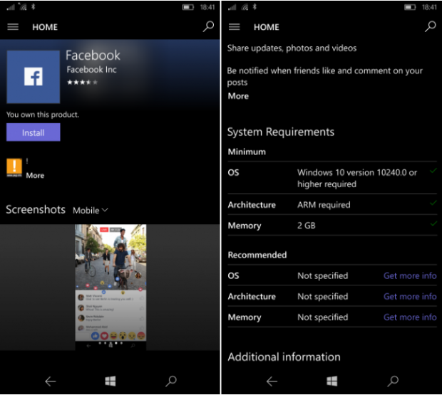Sau nhiều lần khởi động lại máy, khởi động lại ứng dụng hay thậm chí là gỡ bỏ và cài đặt lại ứng dụng, chúng ta có một vài nghi vấn như sau. Ở cửa hàng Windows Store, khi chọn vào ứng dụng Facebook, bạn sẽ thấy yêu cầu tối thiểu của ứng dụng này là 2GB RAM. Điều này dường như chưa bao giờ xuất hiện trước đây. Rất có thể Facebook vừa mới cập nhật thêm những tính năng mới cho ứng dụng trên Windows Phone hay sao mà lại có yêu cầu về phần cứng như thế này?
