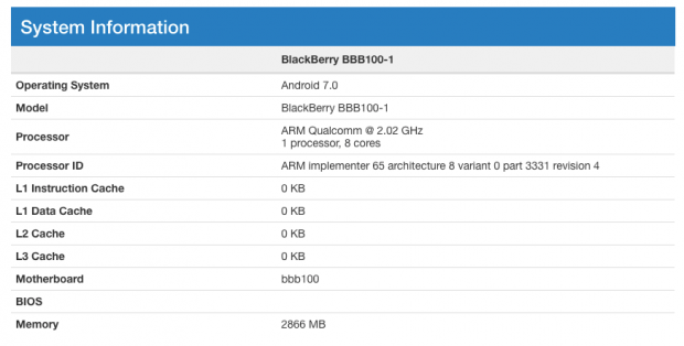 Theo đó, trên Geekbench mới đây đã xuất hiện một smartphone BlackBerry với tên mã “Mercury” (model BBB100-1). Ngoài các chi tiết được xác nhận như màn hình 4.5 inch (tỷ lệ 3:2), bộ nhớ RAM 3 GB, chạy chip Snapdragon 625 cùng hệ điều hành Android 7.0 thì các nguồn tin còn cho biết smartphone này sẽ đi kèm một bàn phím cứng QWERTY tương tự như Priv.