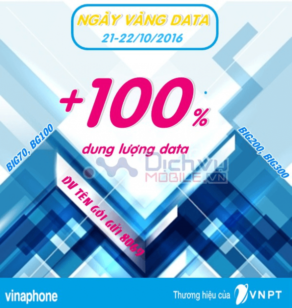 Trong hai ngày 21, 22/10 thuê bao VinaPhone đăng ký các gói 3G BIG70, BIG100, BIG200, BIG300 thành công sẽ được tặng ngay 100% dung lượng 3G gói cước thuê bao chọn đăng ký với cước phí không thay đổi. Tuy nhiên, mỗi thuê bao chỉ được đăng ký 1 gói cước 3G tại một thời điểm nhất định.