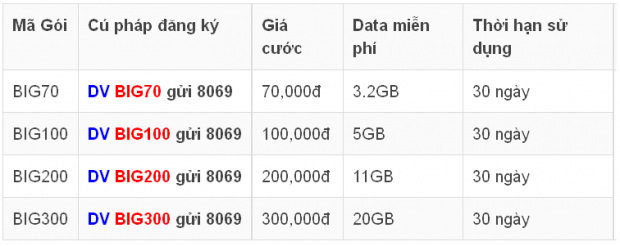 Ví dụ, nếu khách hàng muốn đăng ký gói 3G BIG70 thì chỉ cần soạn tin: DV BIG70 gửi 8069. Sau khi gửi tin nhắn thành công hệ thống sẽ gửi tin nhắn yêu cầu xác nhận đăng ký gói cước kèm theo mã xác nhận, lúc này khách hàng chỉ cần soạn Y _ Mã xác nhận gửi 1543 để hoàn tất đăng ký.