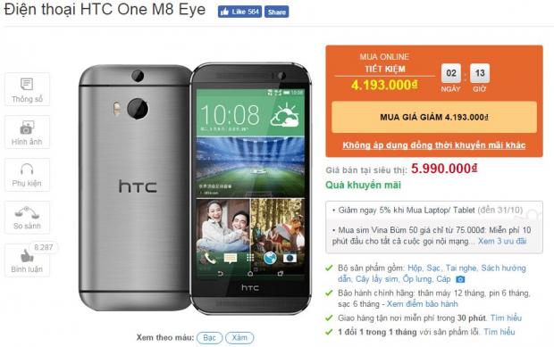 HTC Desire Eye với bộ đôi camera trước sau đều là 13 MP, hỗ trợ chống nước cũng được hạ giá mạnh mẽ. HTC Desire Eye hạ giá từ 5.59 triệu xuống còn 3.9 triệu đồng, giảm hơn 1.5 triệu đồng.