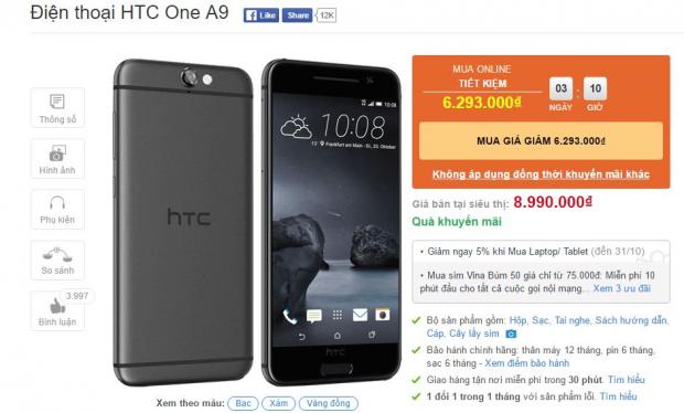 One A9 là sản phẩm có thiết kế đẳng cấp và kiểu dáng khá giống với iPhone, máy có màn hình AMOLED rực rỡ cùng camera hỗ trợ ổn định quang học OIS. HTC One A9 sẽ được hạ từ 8.99 triệu xuống còn 6.29 triệu đồng, giảm tới gần 3 triệu đồng trong chương trình mua online giá tiết kiệm.