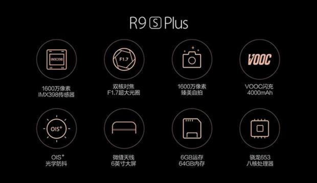 Còn với phiên bản OPPO R9s Plus, đây là một phiên bản nâng cấp của OPPO R9s. Với màn hình 6 inch độ phân giải Full HD, RAM lên đến 6 GB, bộ nhớ trong 64 GB, chip xử lý Snapdragon 653. Không chỉ vậy, camera của máy cũng được bổ sung thêm chống rung quang học OIS, dung lượng pin 4.000 mAh với khả năng sạc siêu nhanh VOOC.