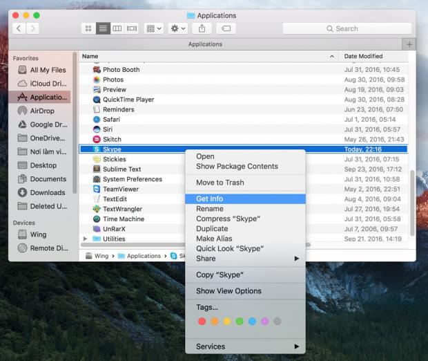 Tiếp theo, bạn cần mở Finder, di chuyển đến thư mục Applications, nhấn chuột phải vào ứng dụng bạn muốn thay đổi biểu tượng và chọn Get Info.