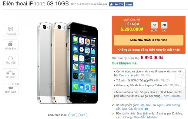 Cụ thể, iPhone 5s đã được hạ giá từ 6.99 triệu xuống còn 6.29 triệu đồng, giảm 700 ngàn đồng. Đây là mức giá thấp nhất của mẫu iPhone 5s từ trước tới nay. Lưu ý là các bạn sẽ đặt mua online để nhận được khuyến mãi này nhé, thời gian chỉ còn hơn 6 ngày nữa thôi.