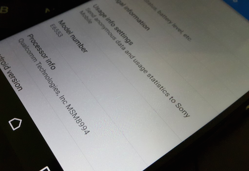 Theo đó, smartphone Xperia Z4 của Sony có mã E6553, chạy Android 5.0 trong đó giao diện được làm phẳng. Mặt sau của Xperia Z4 là camera 20,7 megapixel, cảm biến kích thước 1/2.3 inch tương tự sản phẩm trước. Hình ảnh rò rỉ cho thấy máy dùng chip Snapdragon 810, mã MSM8994.