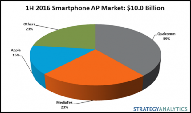 Đứng đầu danh sách đó chính là Qualcomm. Sau sự cố quá tải nhiệt của chip Snapdragon 810 hồi năm ngoái, Qualcomm đã phục hồi và lấy lại vị thế trong nửa đầu của năm 2016. Theo số liệu mới từ Strategy Analytics, Qualcomm duy trì vị trí số một của mình với 39% thị phần.