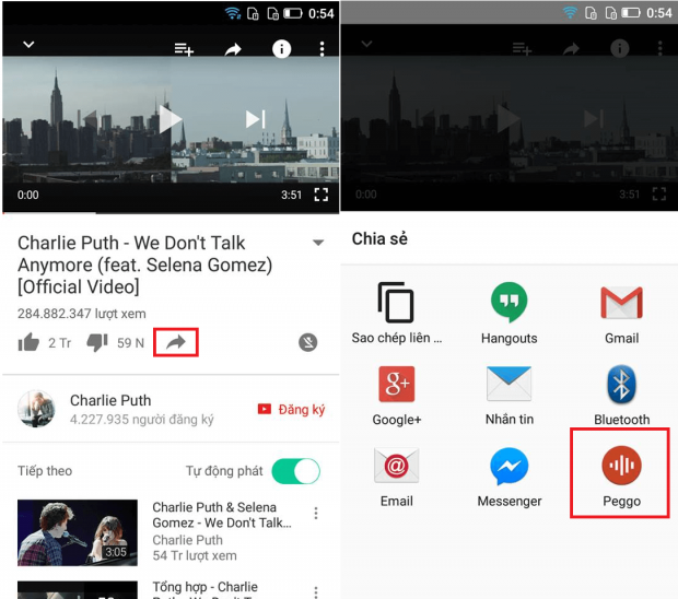 Đầu tiên bạn mở ứng dụng Youtube lên chọn video bạn cần tải, và chọn nút Share sau đó chọn mục Peggo như hình dưới đây
