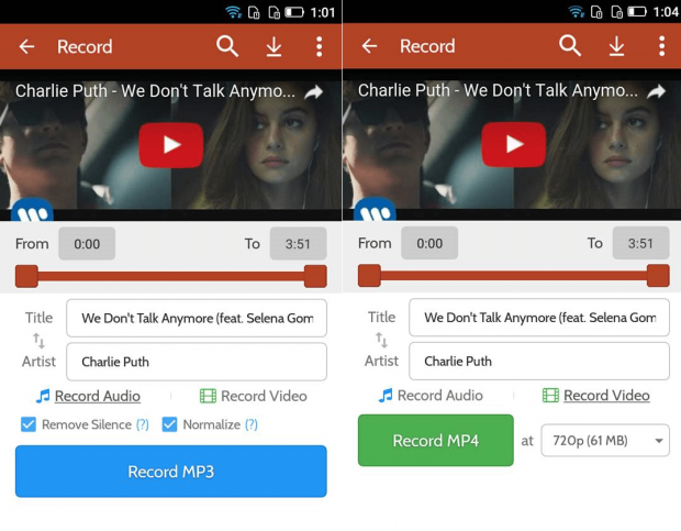 Sau khi chọn bạn sẽ chuyển tới giao diện Record bạn sẽ có 2 tùy chọn tải nhạc dạng MP3 hoặc video, bạn cũng có thể chọn đoạn theo ý mình bằng cách kéo thanh thời gian, và đối với video bạn có thêm tùy chỉnh chất lượng video tối đa là FullHD 1080p.