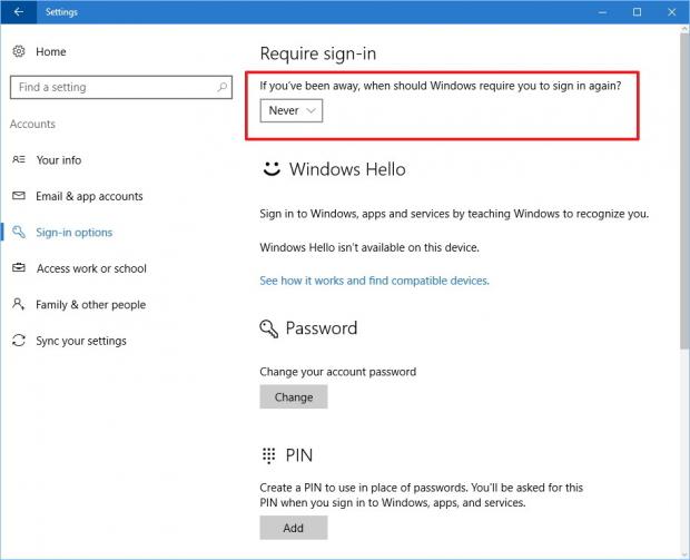 4. Dưới mục 'Require sign-in,' chọn Never dưới menu tùy chọn để hoàn thành tác vụ.