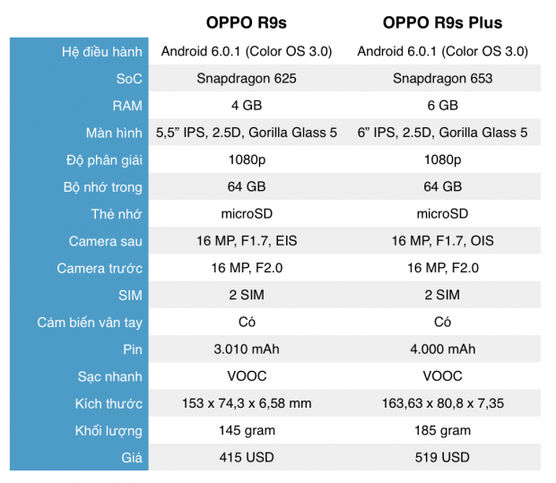 Bộ đôi OPPO R9s và OPPO R9s Plus là hai sản phẩm mới nhất của OPPO vừa ra mắt. OPPO R9s nhiều khả năng sẽ xuất hiện ở Việt Nam khi nó là sự nâng cấp trực tiếp của chiếc OPPO F1 Plus đang bán rất chạy trong nước. Để hiểu thêm về OPPO R9s và OPPO R9s Plus, bạn có thể theo dõi bảng so sánh cấu hình dưới đây: