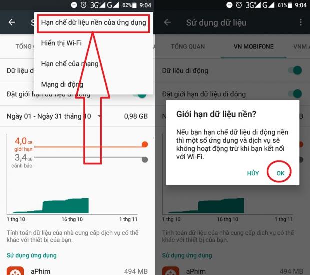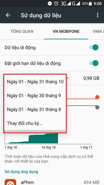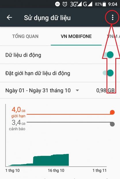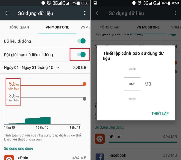Thiết lập giới hạn và mức cảnh báo sử dụng 3GThiết lập chu kỳ đặt giới hạn dữ liệu. Ví dụ dung lượng 3G của bạn được cộng vào ngày 1 hàng tháng thì chu kỳ sẽ là từ ngày 1 đến cuối thángNgười dùng có thể tùy chỉnh thiết lập mức cảnh báo và mức giới hạn, trên các thiết bị Android người dùng không để đặt mức giới hạn bằng 0 như trên iOS. Mỗi thiết bị thì phần cài đặt có thể khác nhau đôi chút.