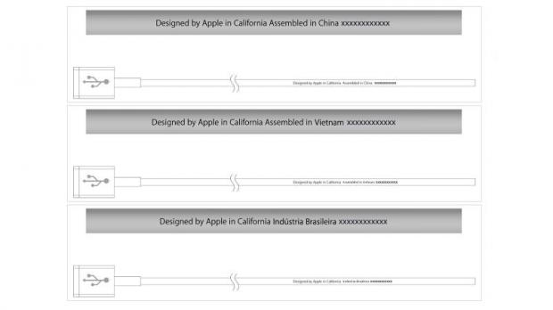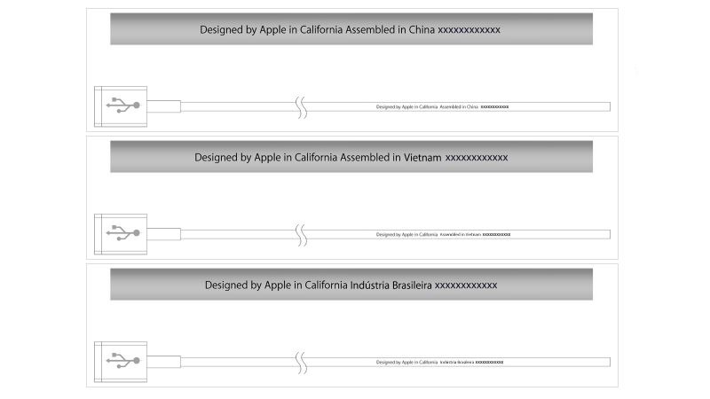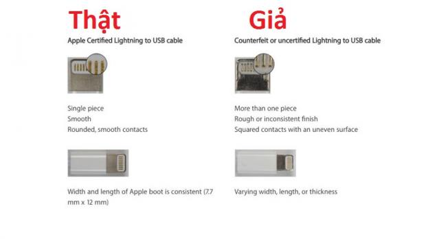 Đối với cáp Lightning, bạn chỉ nên mua những sản phẩm được chứng nhận bởi Apple và có logo Made for iPod/iPhone/iPad kèm theo. Ở dây sạc thật sẽ có dòng chữ Designed by Apple in California và theo sau là nơi lắp ráp/sản xuất như Assembled in China, Assembled in Vietnam, hay Indústria Brasileira cùng 12 số ở cuối cùng.