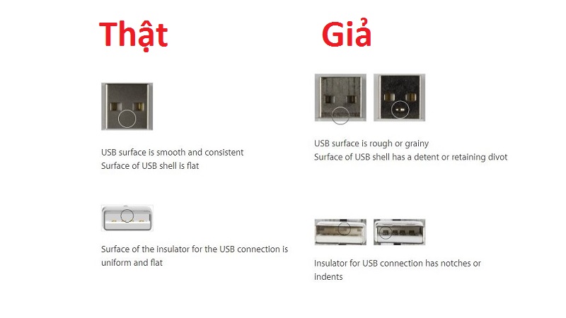 Đối với đầu cổng USB, phần kim loại ở đầu cáp thật sẽ sáng và mịn hơn, còn loại dởm có màu xỉn hơn. Đồng thời, các mạch đồng bên trong cũng sáng hơn so với hàng nhái.