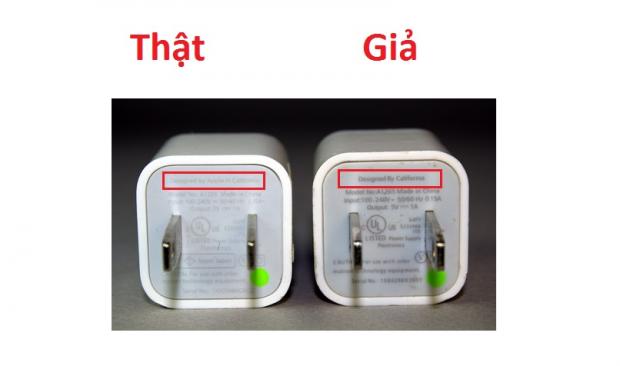 Đối với củ sạc thật, ở trên cùng sẽ có dòng chữ Designed by Apple in California, còn hàng dởm sẽ là Designed by Abble in California hoặc Designed by China in California... Mặc khác, ngoại hình của hàng giả được làm rất tệ, hai chấu kim loại cũng xộc xệch, thậm chí bạn sẽ có cảm giác như có thể dùng ngón tay tháo rời được hai chấu này ra khỏi phần thân cốc sạc.