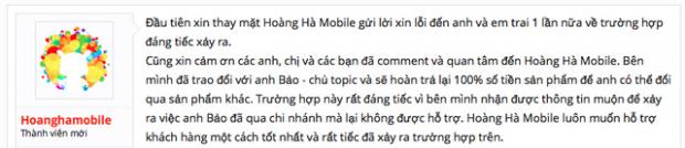 Chiếc Xiaomi Mi4 này được mua tại cửa hàng Hoàng Hà MobileThế nhưng, không lâu sau khi chia sẻ câu chuyện của mình, với sự hỗ trợ của Ban quản trị diễn đàn, đại diện của Hoàng Hà Mobile đã chính thức lên tiếng. Bên cạnh lời xin lỗi vì đã tiếp nhận thông tin muộn, Hoàng Hà Mobile khẳng định sẽ hoàn trả khách hàng 100% số tiền để mua sản phẩm khác. Ngoài ra, Ban quản trị diễn dàn MIUI.vn cũng đã chuyển thông tin này cho Xiaomi, tuy nhiên vẫn chưa nhận được câu trả lời nào từ hãng.