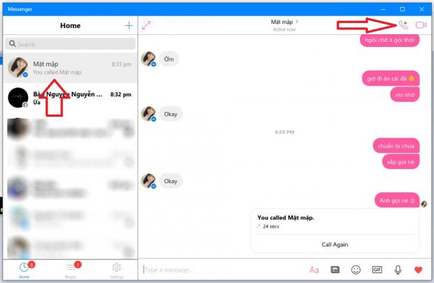 Tại một cuộc hội thoại bất kì bạn sẽ để ý thấy biểu tượng chiếc điện thoại và máy quay nằm phía trên bên phải, đây chính là 2 tính năng gọi thoại thông thường và video call. Click vào 1 trong 2 biểu tượng đó để bắt đầu thực hiện cuộc gọi.