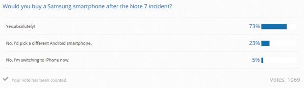 Như ảnh bên trên, trong 1.069 người bình chọn thì có đến 73 % người dùng sẽ tiếp tục ủng hộ Samsung, chỉ 23 % là muốn mua một chiếc Android của hãng khác và quyết định chọn iPhone để thay thế dường như chỉ có 5 % người dùng.