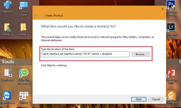 Tiếp theo, chúng ta sẽ tạo shortcut để bật Wi-Fi, tương tự như trên. Nhưng bạn hãy Copy và paste dòng lệnh bên dưới vào ô Type the location of the item, thay từ Wi-Fi bằng tên kết nối Wi-Fi của bạn.